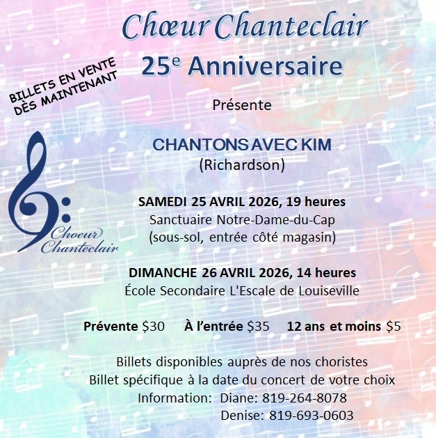 Bonjour, Mme Diane Brodeur, membre de l'Areq, vous invite au 25e anniversaire du Choeur Chanteclair. Les billets sont en vente dès maintenant auprès des choristes. Vous trouverez plus d'informations dans le fichier ci-joint.